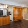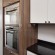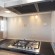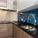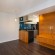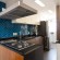 A cozinha está equipada com cooktop de 4 bocas, exaustor, grelha, geladeira, forno elétrico embutido e microondas embutido, todos Brastemp. A rodabanca é de cerâmica azul em formato espinha de peixe, alegrando o ambiente. Ela é rica em armários planejados e seu piso é de porcelanato que imita madeira.