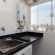 Ela está integrada com a cozinha americana através de uma bancada de granito preto em cascata.