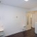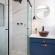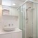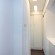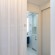 O banheiro é completamente revestido de porcelanato marmorizado branco e sua porta também é suspensa de correr. Ele conta com armários planejados e gabinete, além de uma charmosa pia de cobre.