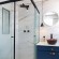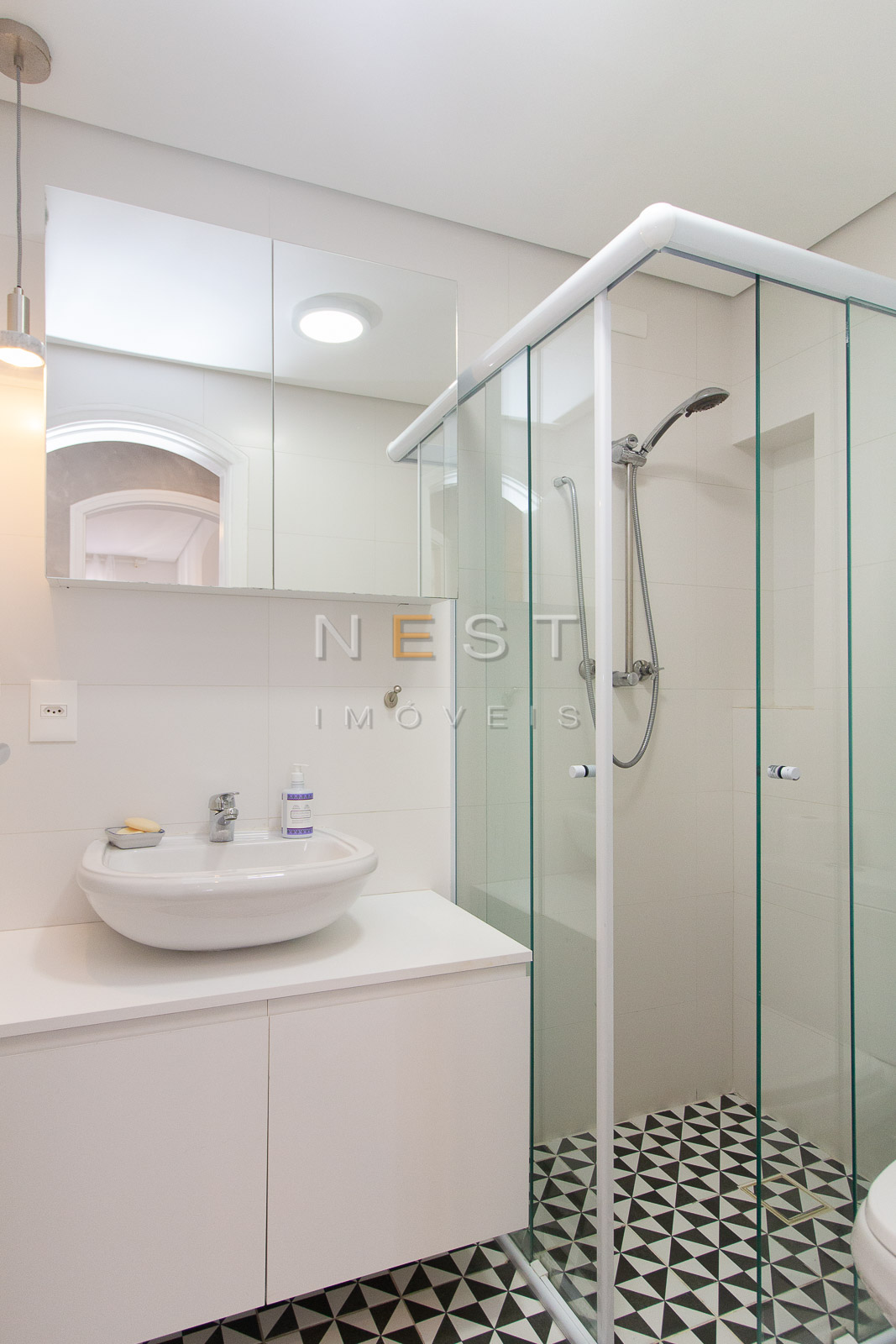 No lado oposto está o banheiro social, com piso em cerâmica com grafismo preto e branco e revestimento em porcelanato branco fosco. Ele conta com gabinete e armário superior, além de uma pia de sobrepor.