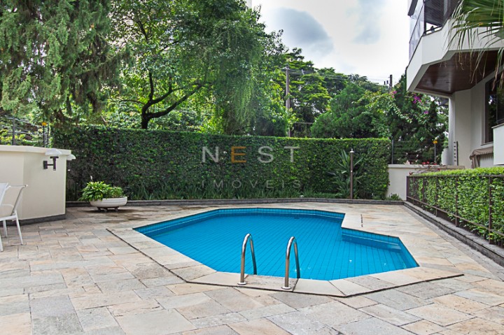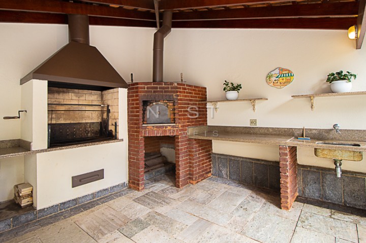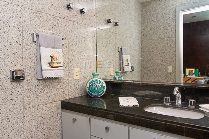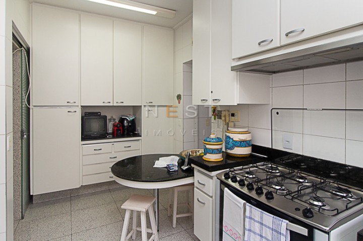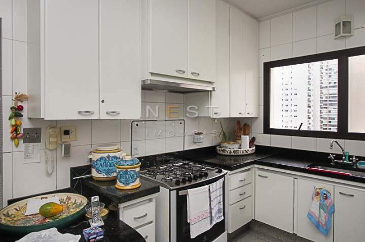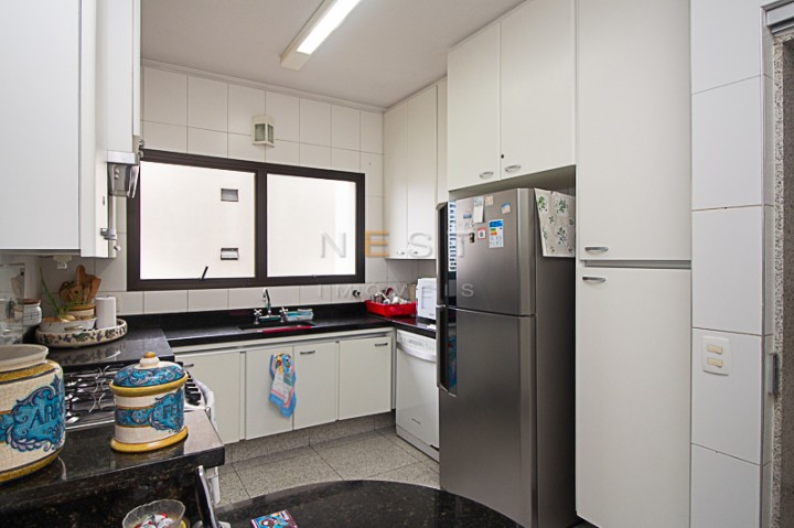 As bancadas da cozinha são em granito preto e através dela acessamos a área de serviço, composta de uma ampla lavanderia, repleta de armários, além das dependências de empregada e entrada de serviço.