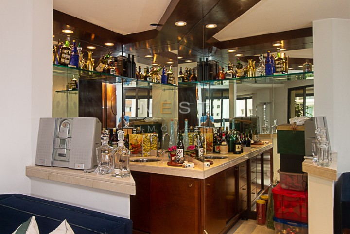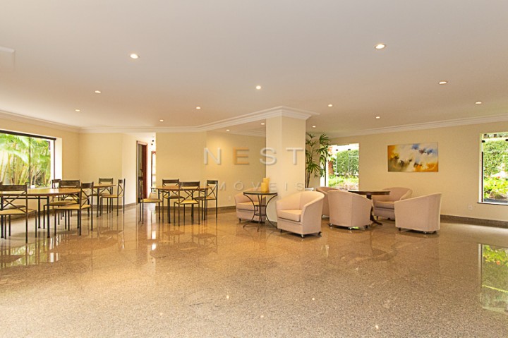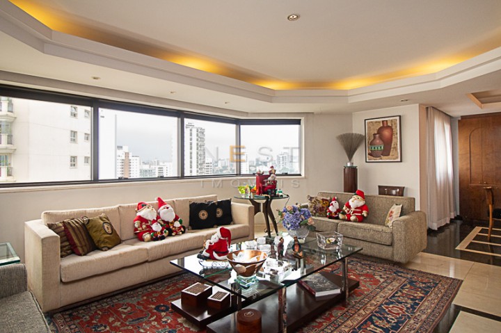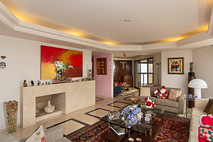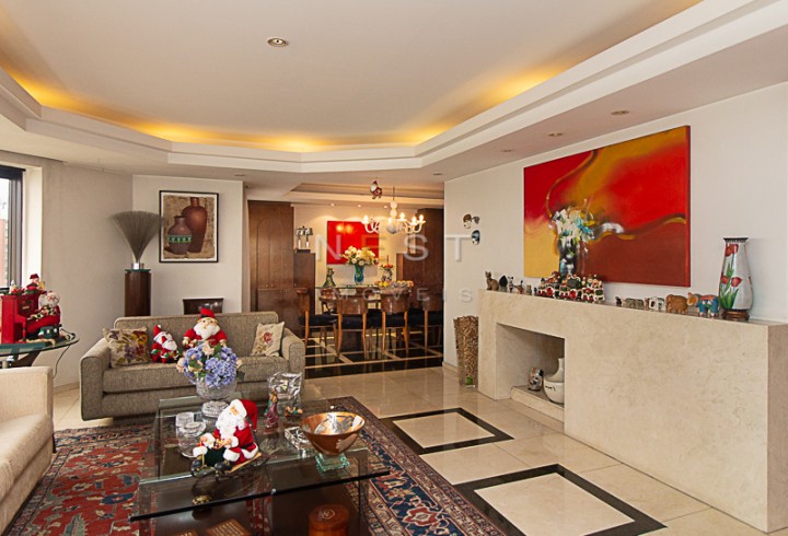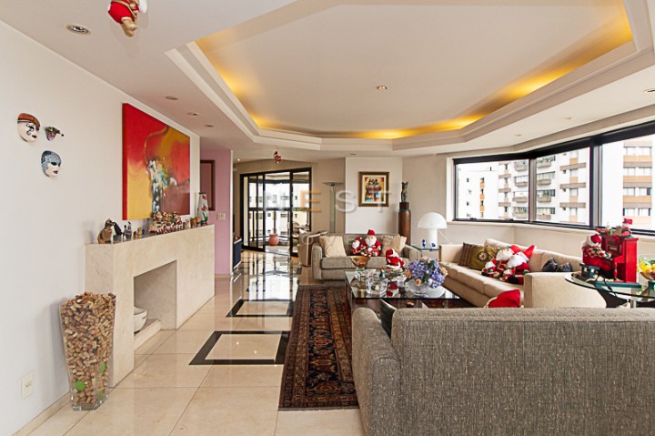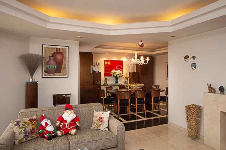 À direita da entrada temos um amplo living, com aproximadamente 55m2, composto de três espaços: uma área de estar com um bar lateral e acesso à agradável varanda com fechamento em vidro, uma segunda área de estar ampla com lareira e parede circular com janelas, e uma sala de jantar. O piso de todos os ambientes é em mármore marfil crema e escuro, com padronagem quadrada.