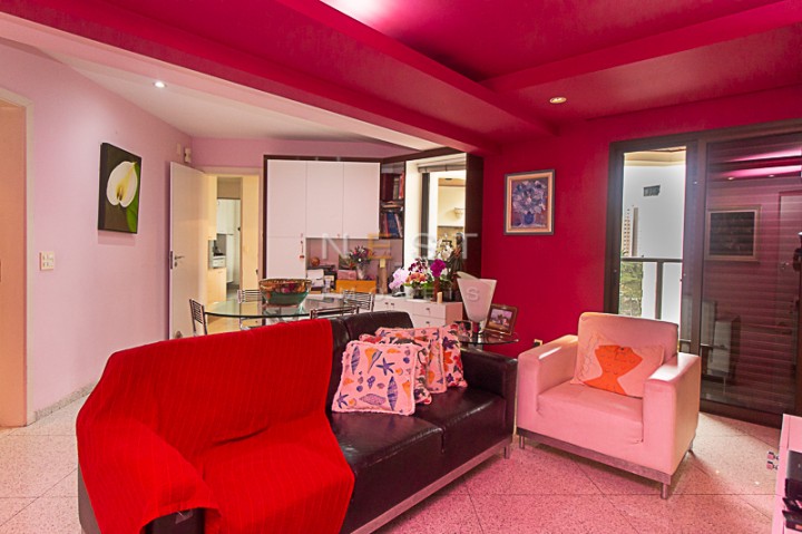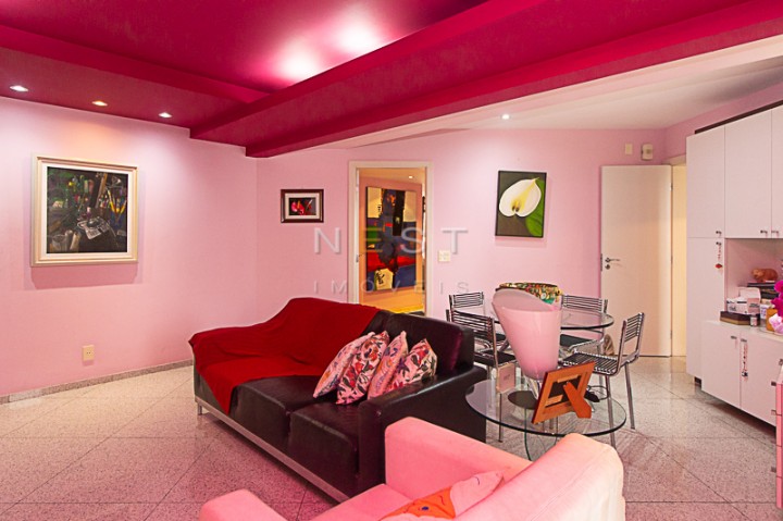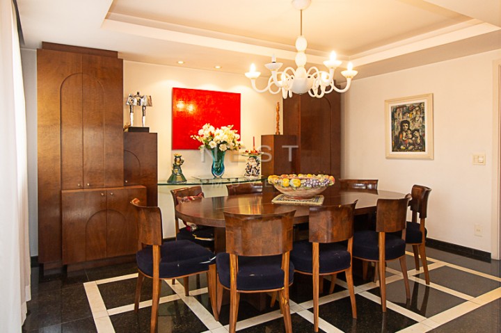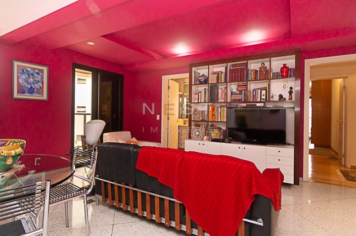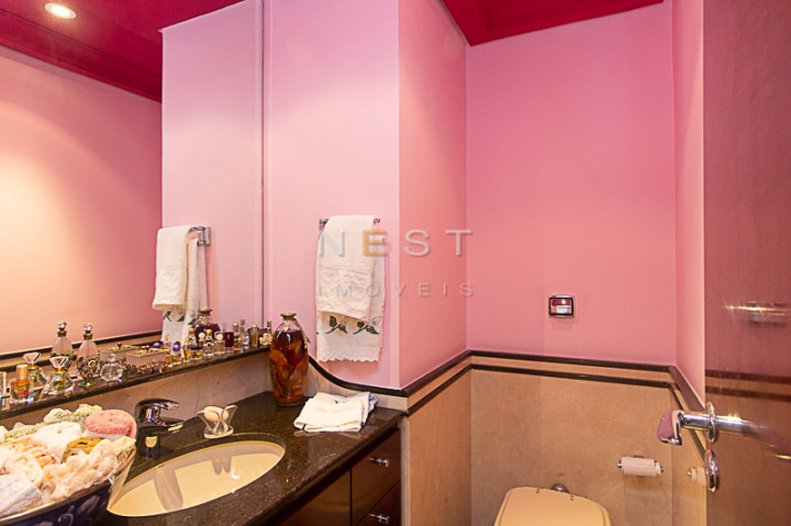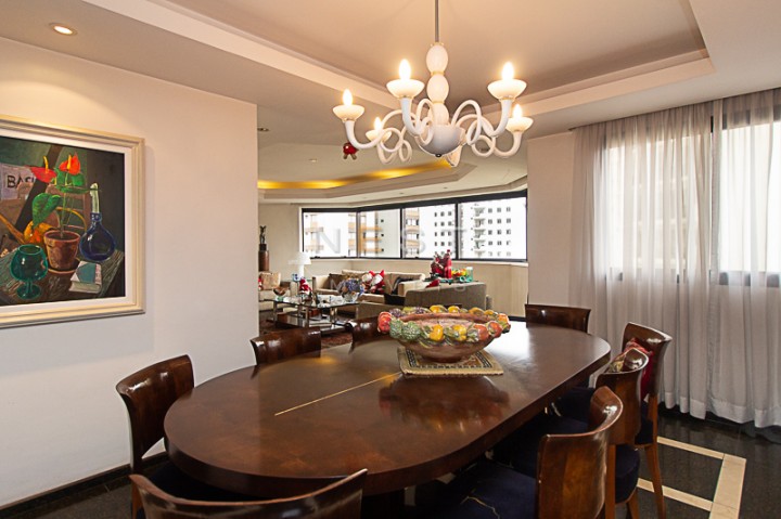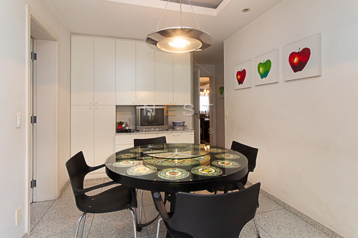 À esquerda temos o lavabo e a passagem para uma sala íntima, que foi ampliada devido a abertura da quarta suíte que existia aí. Isso permitiu a criação de um agradável espaço de estar com banheiro completo e acesso a uma varanda. Através de uma porta é possível acessar a sala de almoço.