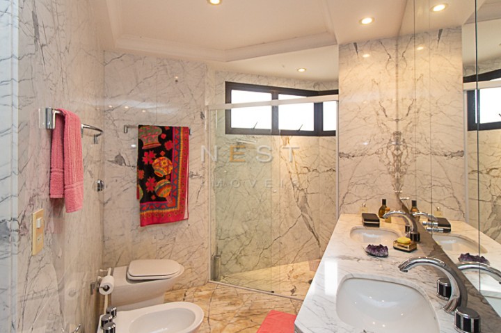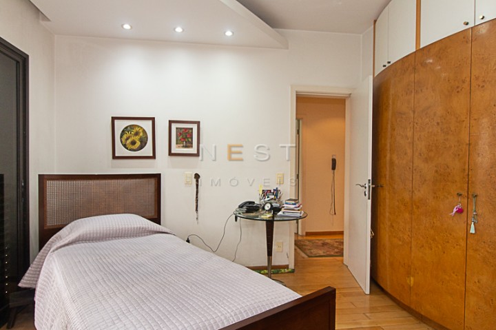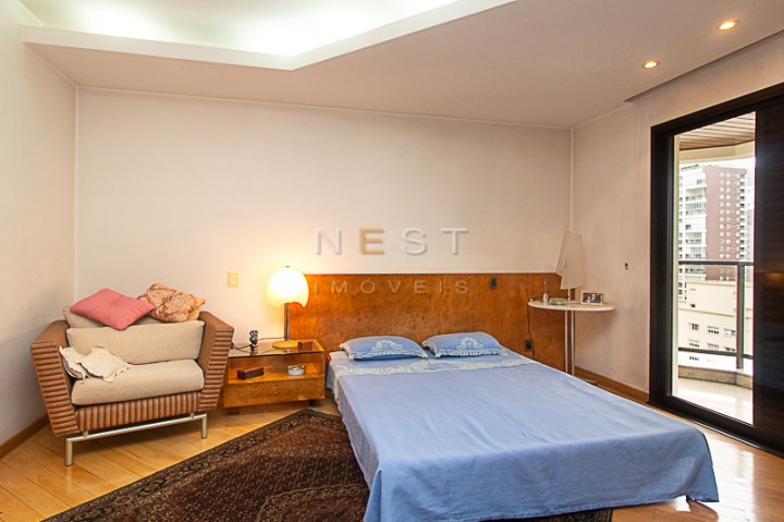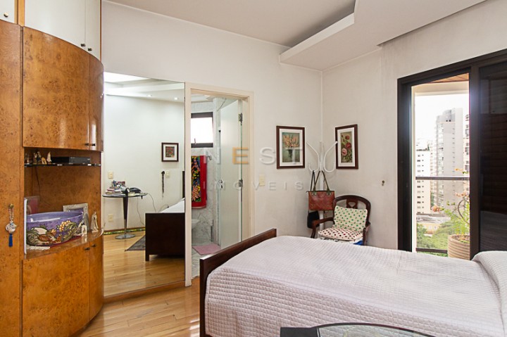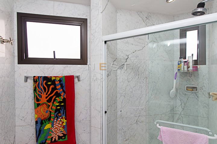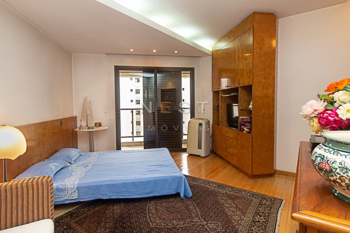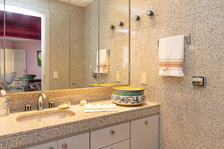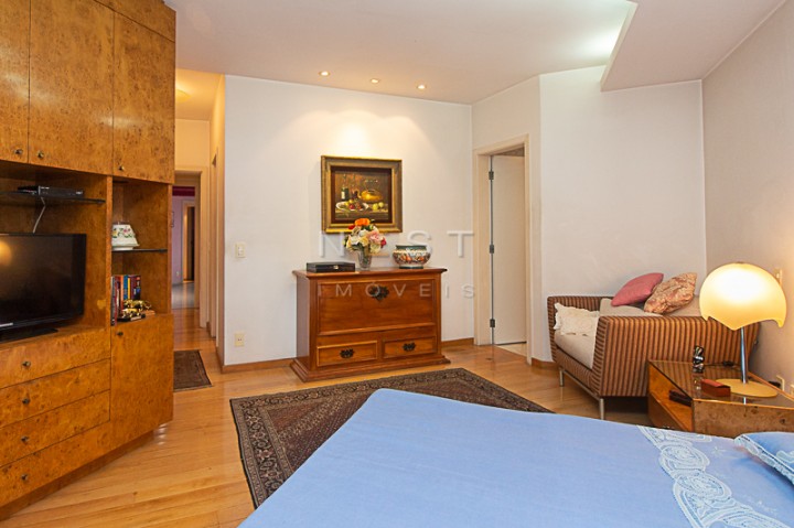 A partir da sala íntima temos acesso aos dormitórios. O piso da área íntima é em madeira clara e as três suítes contam com armários planejados, varandas e banheiros com materiais e acabamentos de qualidade. No hall de distribuição temos um amplo armário de rouparia