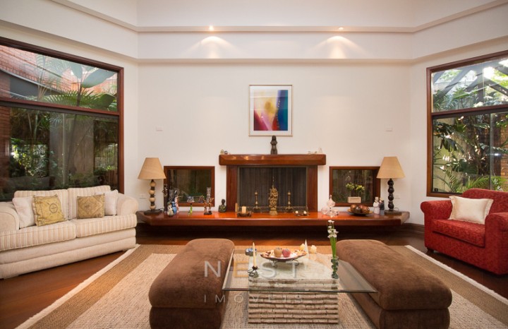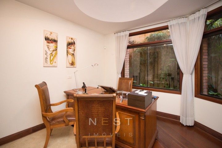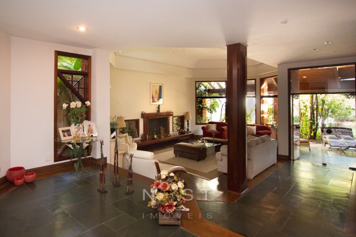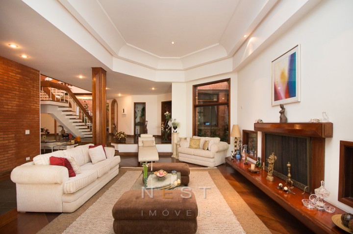 Partindo do hall de entrada, à esquerda, temos primeiramente o lavabo e, ao lado, uma porta que leva ao escritório, também rico em janelas que dão para um corredor lateral com jardim. No mesmo nível do bar, do outro lado da sala íntima, temos a grandiosa sala de estar com lareira, pé direito elevado, amplas janelas de vidro e piso de tábuas de madeira. Aqui também temos o corredor que dá acesso à varanda.