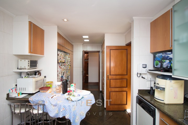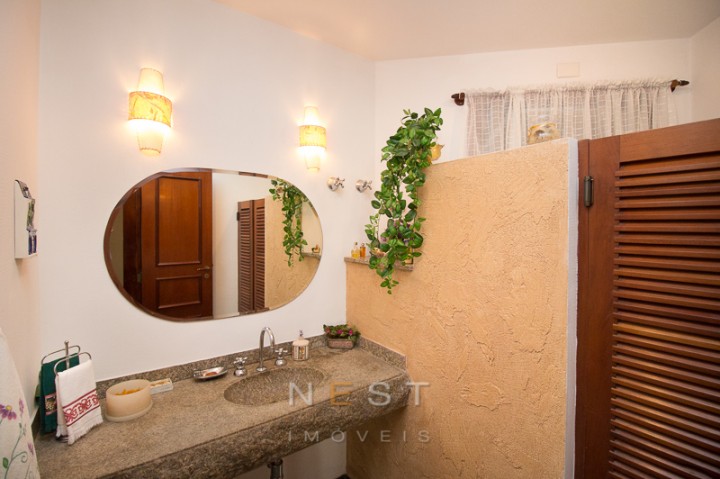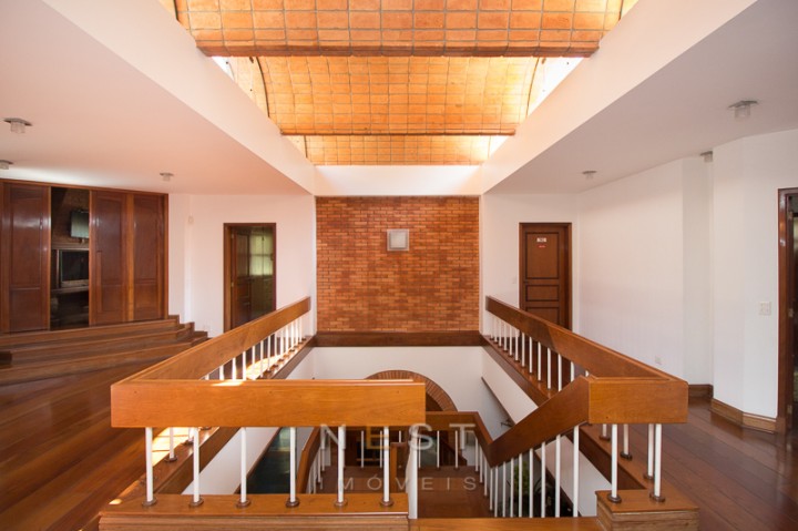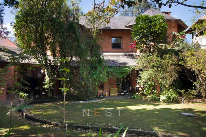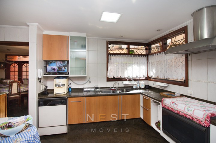 Seguindo à direita temos uma primeira porta que dá para a cozinha, espaçosa, com uma bancada central e ótima distribuição de armários e eletrodomésticos. De um lado, a cozinha está ligada à área de serviço, com lavanderia ampla, despensa, dependência completa de empregada e uma escada que leva ao segundo piso. A partir da lavanderia acessamos o quintal com piso de pedra, onde está o canil e um banheiro de serviço. Esta área está ligada aos fundos da casa, através de um corredor lateral, e também à entrada da casa, através de um portão de madeira. Na entrada temos a ampla garagem parcialmente coberta que comporta até seis carros.