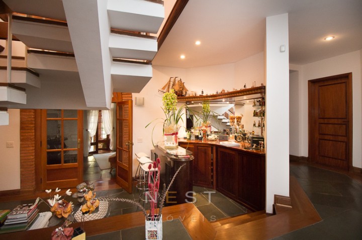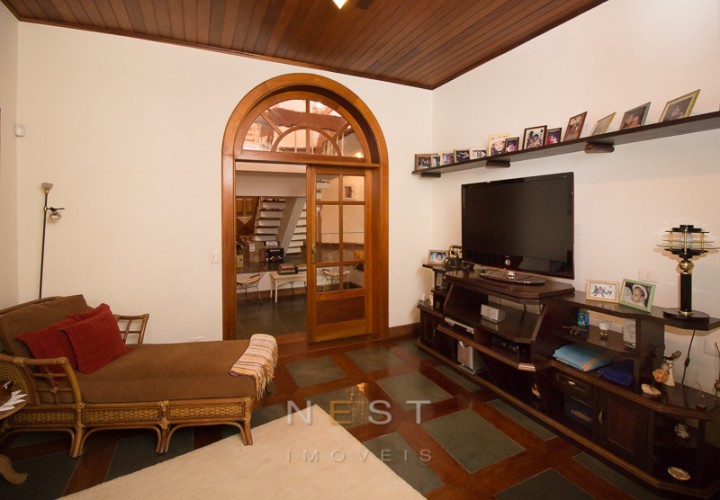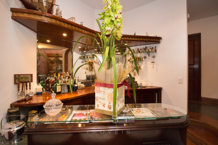 Abaixo da escada, descendo três degraus, temos à direita um charmoso e bonito bar aberto. Contornando a escada, à frente, temos uma porta de madeira com vidro que dá para a agradável sala íntima, também com amplas janelas e porta de vidro que dão acesso para a varanda. Hoje ela funciona como uma sala de TV, com confortáveis sofás e chaise longue.