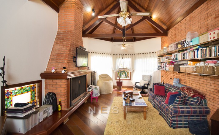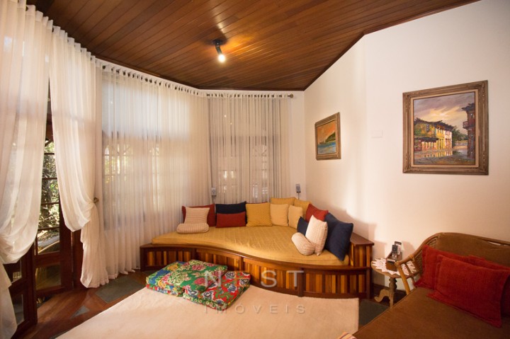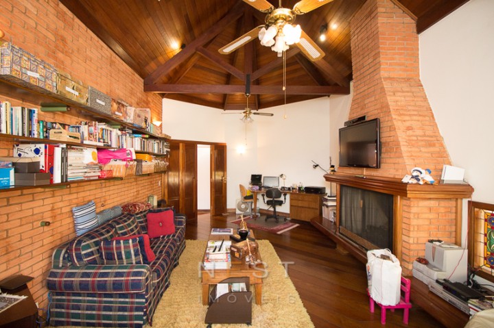 Entre os dois quartos temos uma segunda sala íntima, em um nível um pouco mais elevado que o dos quartos, muito ampla, também com lareira, teto de madeira inclinado e com pé direito alto e janelões que dão para o jardim. Uma das paredes é em tijolinho aparente, deixando-a muito agradável e aumentando ainda mais a sensação de acolhimento.