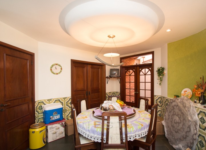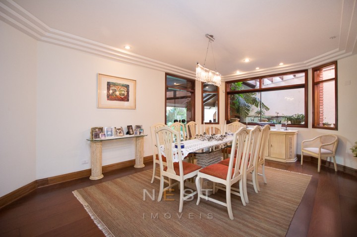 A partir da cozinha temos uma segunda porta que leva à ampla copa, rica em janelas que dão para o jardim lateral. Aqui temos uma pia de apoio e espaço para uma mesa de 6/8 pessoas. Uma segunda porta no corredor leva à ampla sala de jantar, com espaço para até 12 pessoas, piso com tábuas de madeira, amplas janelas e porta de vidro que leva à varanda da casa.