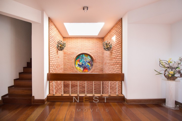 Quando entramos na casa nos deparamos com um hall com piso de ardósia importada, que se abre para um ambiente espaçoso e com vários cômodos muito bem planejados. O hall possui pé direito duplo, com claraboia e um belo e imponente vitral que se destaca.