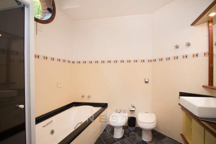 À direita da escada temos uma porta que leva a um banheiro completo com banheira, que atende os dois quartos que existem deste lado. Ambos são amplos e ricos em armários, sendo um com vista lateral e outro com vista para os fundos.