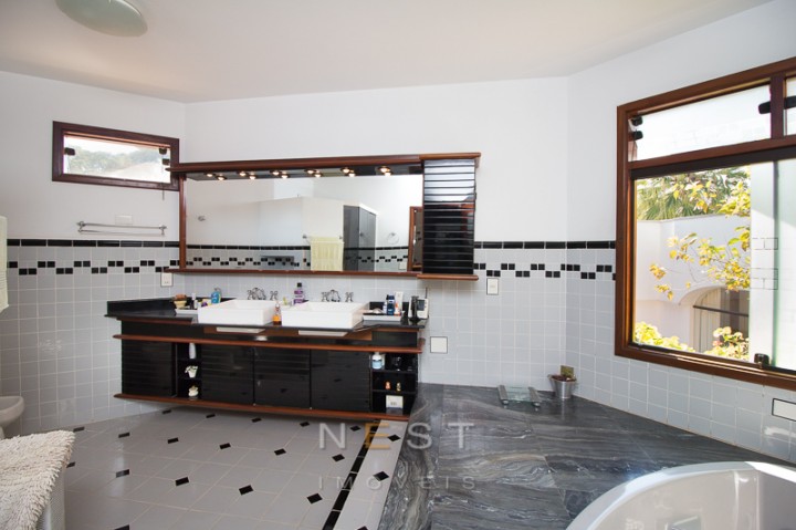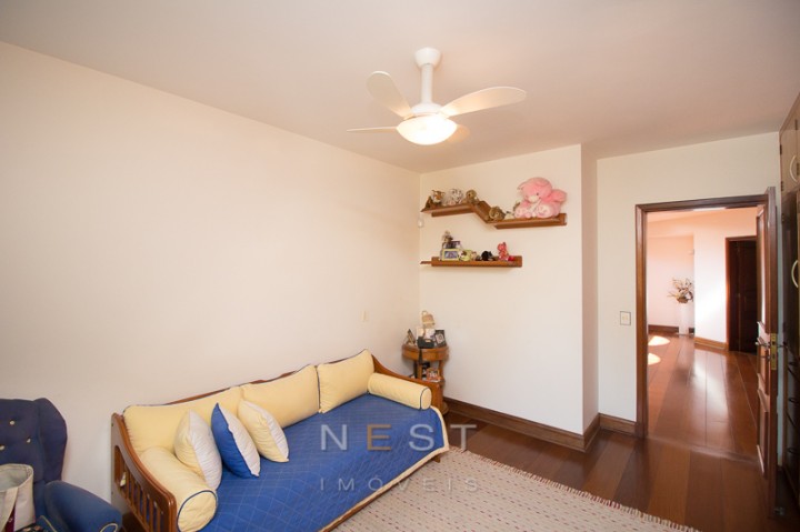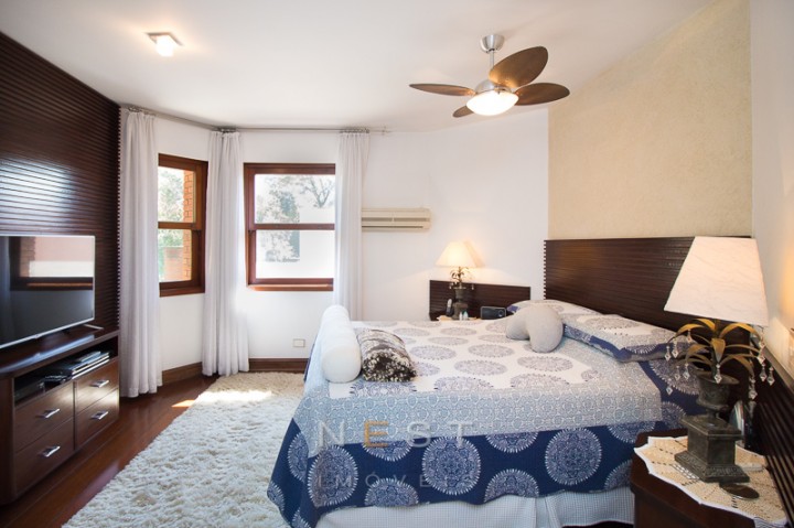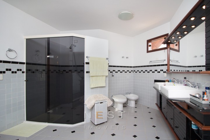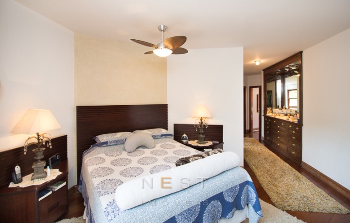 A porta seguinte leva à suíte master, que é composta por um imenso closet, um banheiro muito espaçoso com hidromassagem e pia dupla, e o quarto amplo com janelas voltadas para face norte.
