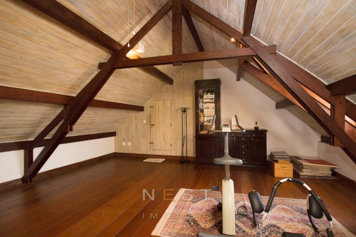 À esquerda temos uma outra escada que leva ao sótão, um espaço diferenciado que pode ser transformado em um quarto, em outra sala de estar ou sala de jogos. Possui lindo teto de madeira inclinado, acompanhando a queda do telhado. No fundo há uma porta que leva a um maleiro e outra que leva a uma pequena varanda que dá para a frente da residência.