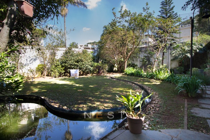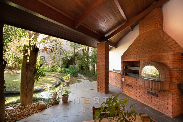 A parte dos fundos da casa é composta de uma ampla varanda com piso de ardósia, que percorre todo o perímetro das três salas (estar, íntima e jantar) e fica voltada para o jardim. Integrada a ela temos uma área de laser com churrasqueira e forno de pizza. O jardim nos fundos é gramado, intercalado com plantas e árvores frutíferas. Um lago com carpas serpenteia a lateral direita, chegando até a cascata que fica no final do terreno. No fundo do jardim há também um deque com ducha.