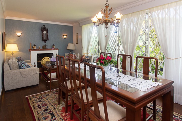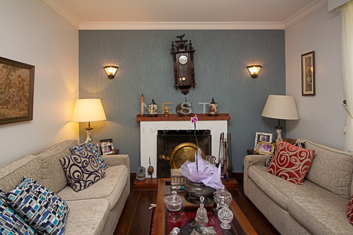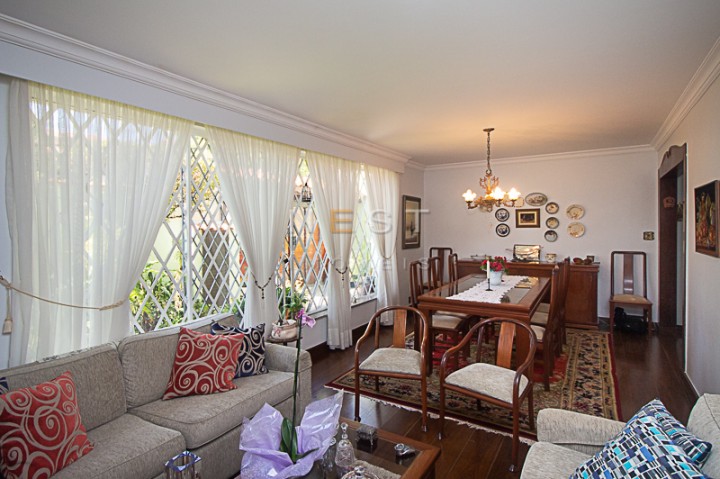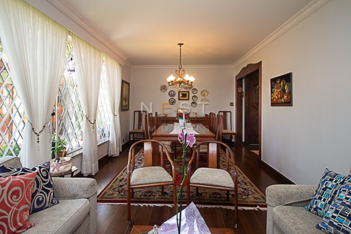 Uma linda porta de madeira leva ao hall social. À esquerda temos primeiramente a escada em “U”, que leva ao segundo andar. Mais adiante temos o lavabo e, à frente, a porta de madeira e vidro que acessa a cozinha. Um amplo vão com batente de madeira, à direita da entrada, leva ao espaçoso living, com mais de 25m2. Ele possui uma parede praticamente inteira com janelas de vidro de correr que dão para o jardim frontal, e uma charmosa lareira. Todo o piso da área social possui um lindo piso de madeira escura com tábuas largas.