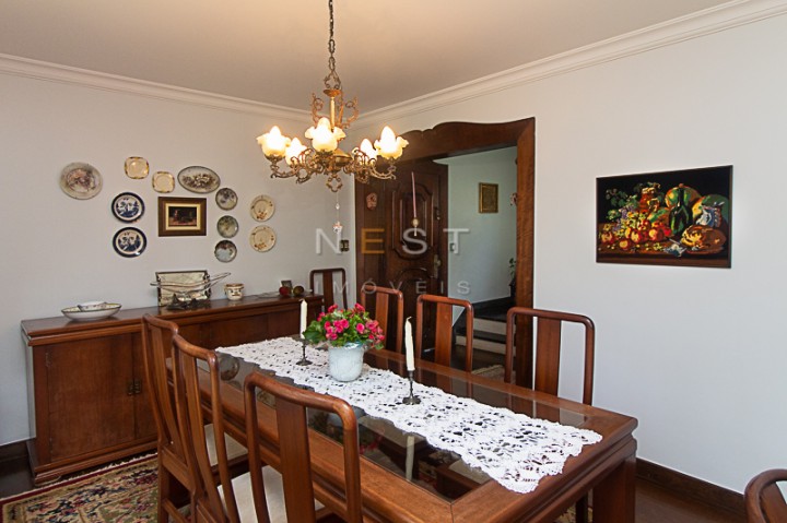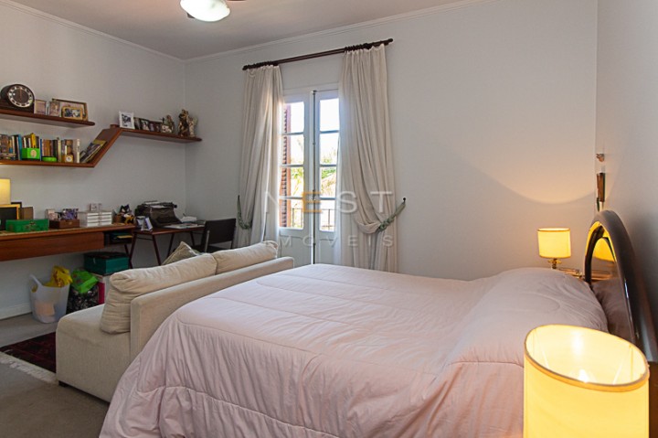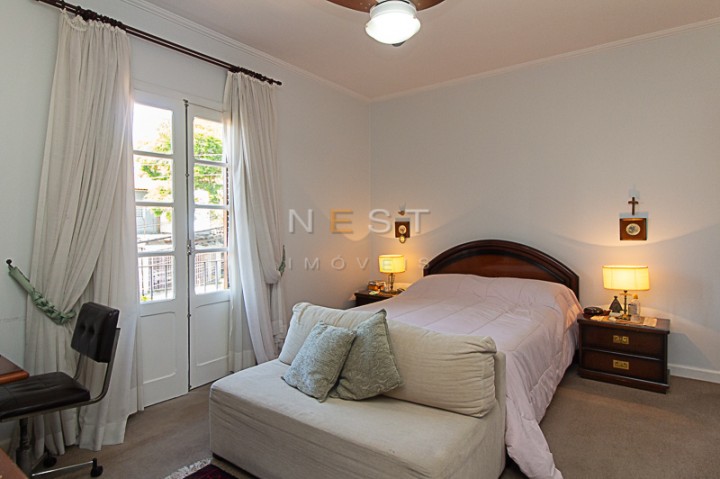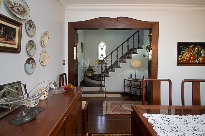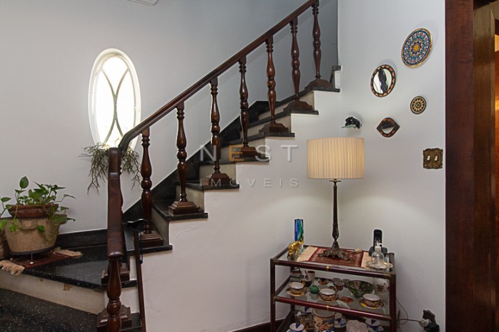 Voltando para o interior da casa, uma escada de granilite preto, com dois vitrôs ovais e corrimão de madeira leva ao segundo andar, onde está a área íntima, com piso de carpete claro.