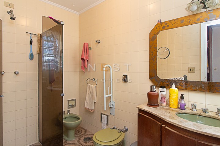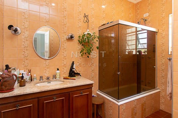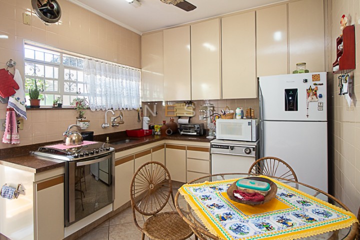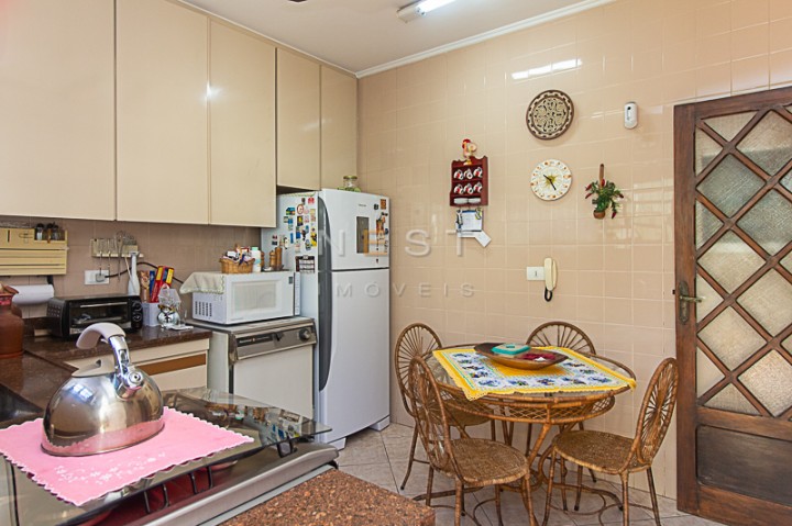A cozinha, em formato retangular, possui armários planejados. Uma porta lateral acessa o fundo do imóvel, composto por uma edícula e um quintal com quase 20m2, predominantemente de lajota. A lavanderia possui uma porta que acessa a garagem coberta e, à esquerda, uma escada leva ao segundo andar onde estão as dependências de empregada.
