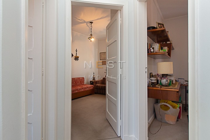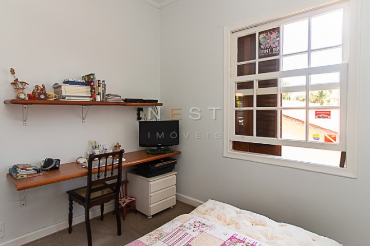 Um pequeno hall faz a distribuição dos cômodos. A primeira porta à direita acessa o banheiro social, com formato em “L” e banheira. Logo em seguida temos a suíte, composta de um amplo quarto com mais de 15 m2, uma charmosa varanda que dá para a frente do imóvel, um espaçoso closet e um banheiro.